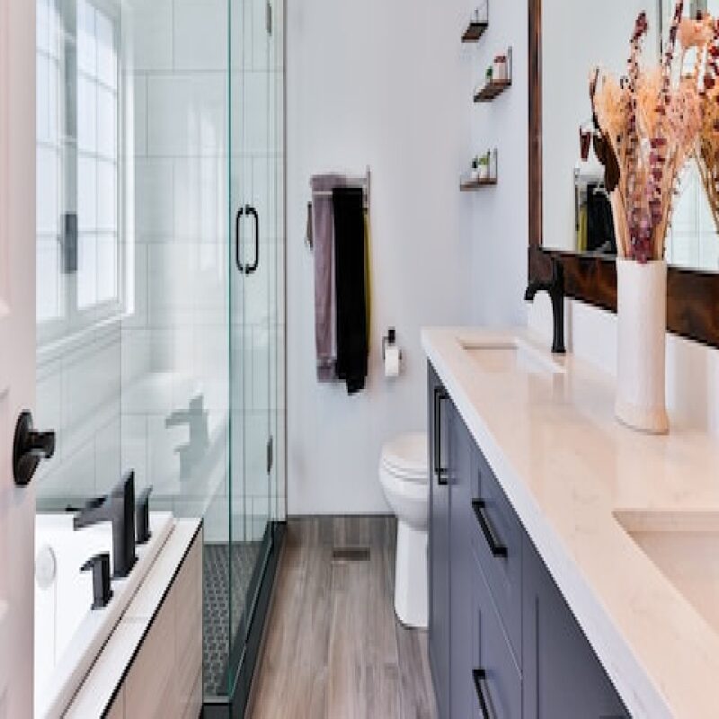 Luxury Ensuite: Oversized bathroom with a separate deep-soaking tub and glass-enclosed rain shower, complemented by high-end marble finishes and heated towel racks.