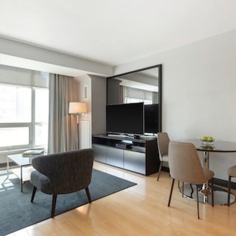 Executive Workspace: Dedicated, full-size executive desk and ergonomic chair with high-speed, prioritized Wi-Fi access for productivity.
